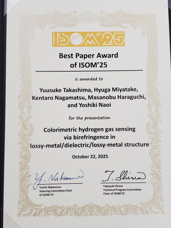 高島祐介助教(@大学院社会産業理工学研究部 電気電子系)らが、10月20日~10月22日に宇都宮市で開催された国際会議International Symposium on Imaging, Sensing, and Optical Memory 2025 (ISOM’2025)においてBest Paper Awardを受賞しました。